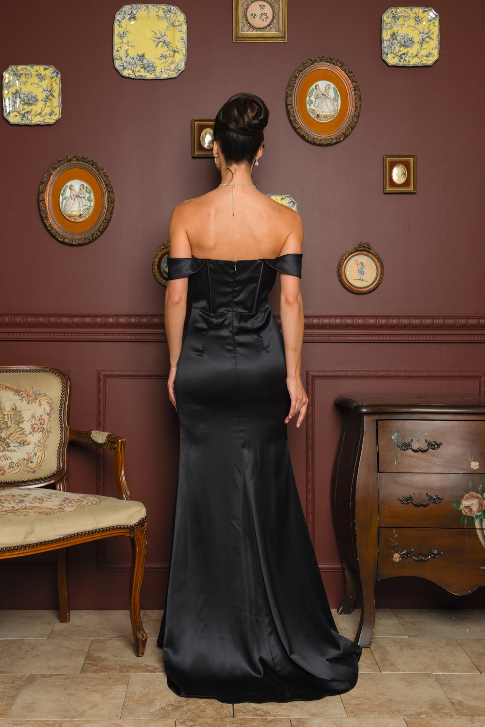 Solid color satin off shoulder maxi dress with boning on the top, slit, full lining, bra cups, and back zipper. Dress doe not have stretch. *This style does have a boutique's MAIN LABEL instead of the RICARICA. *