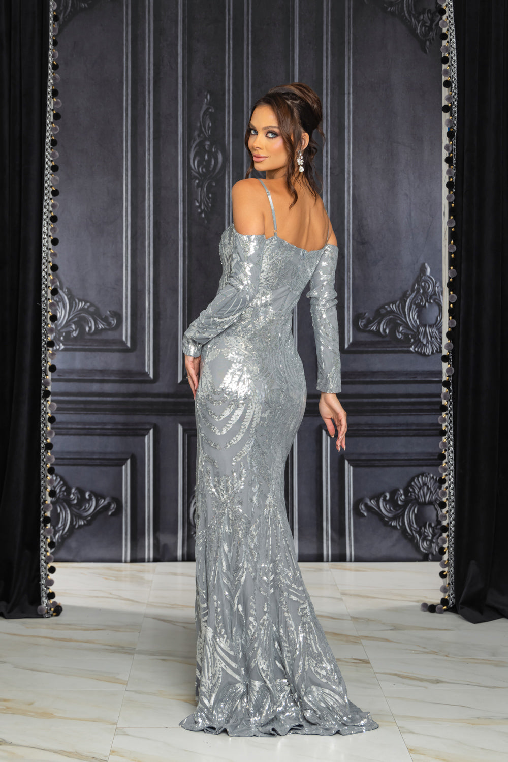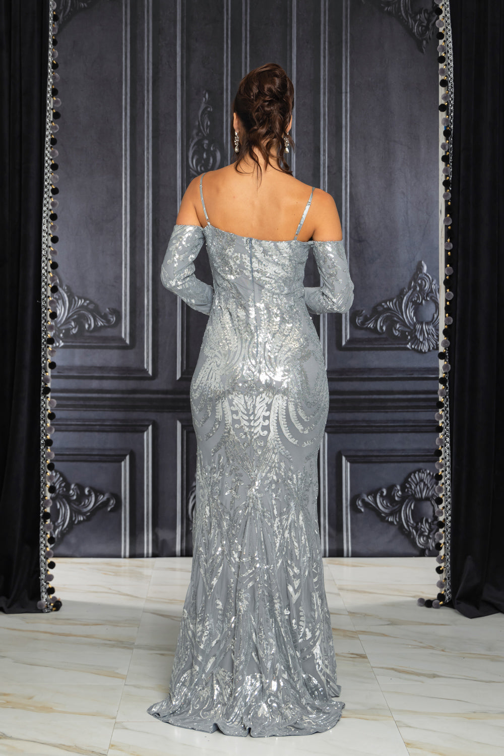 Patterned sequin cold shoulder long sleeve maxi dress with adjustable straps, full lining, slit, mesh insert and back zipper. Dress has good stretch.
