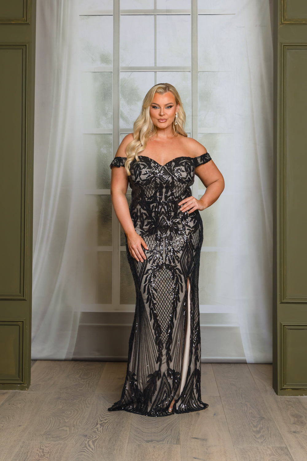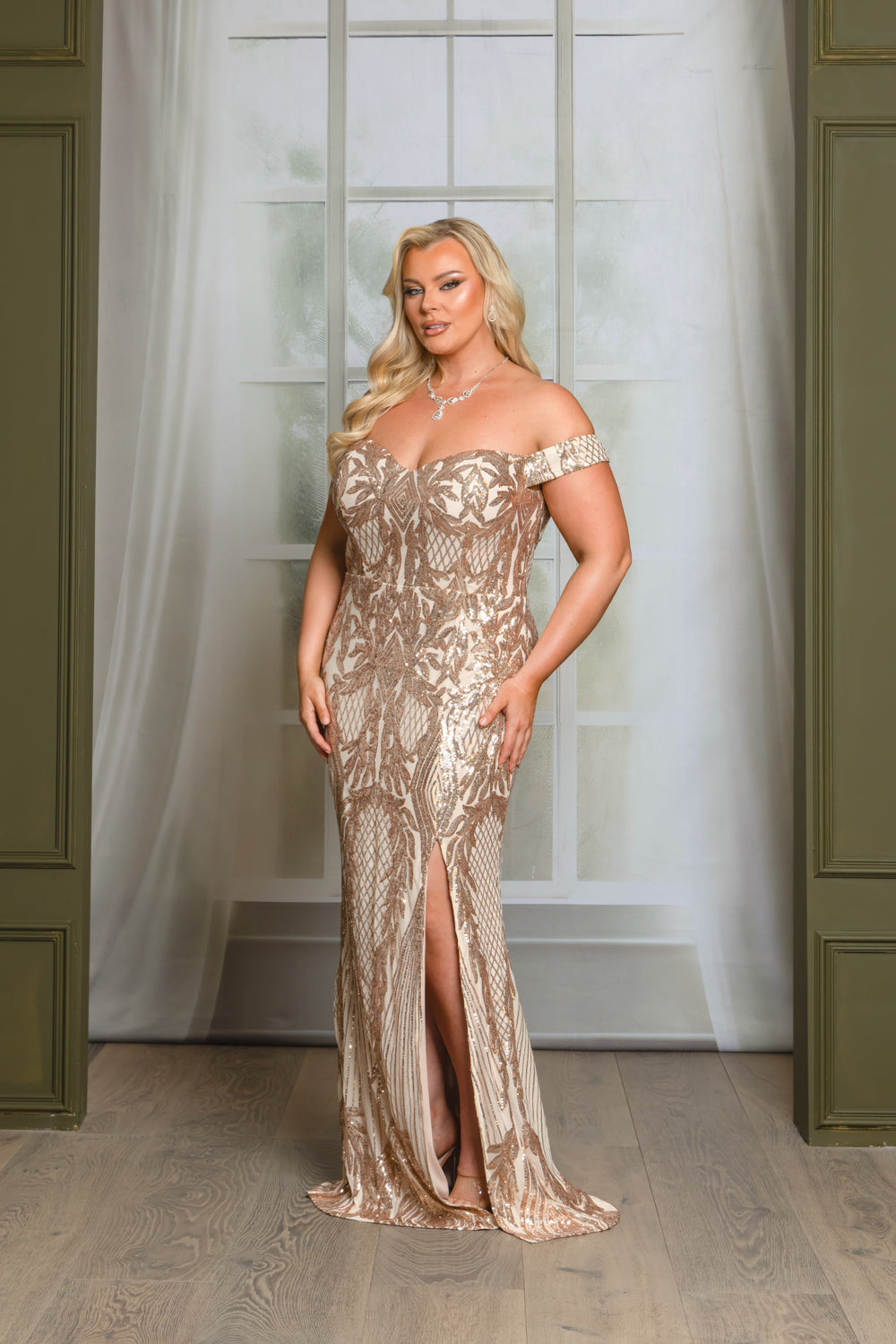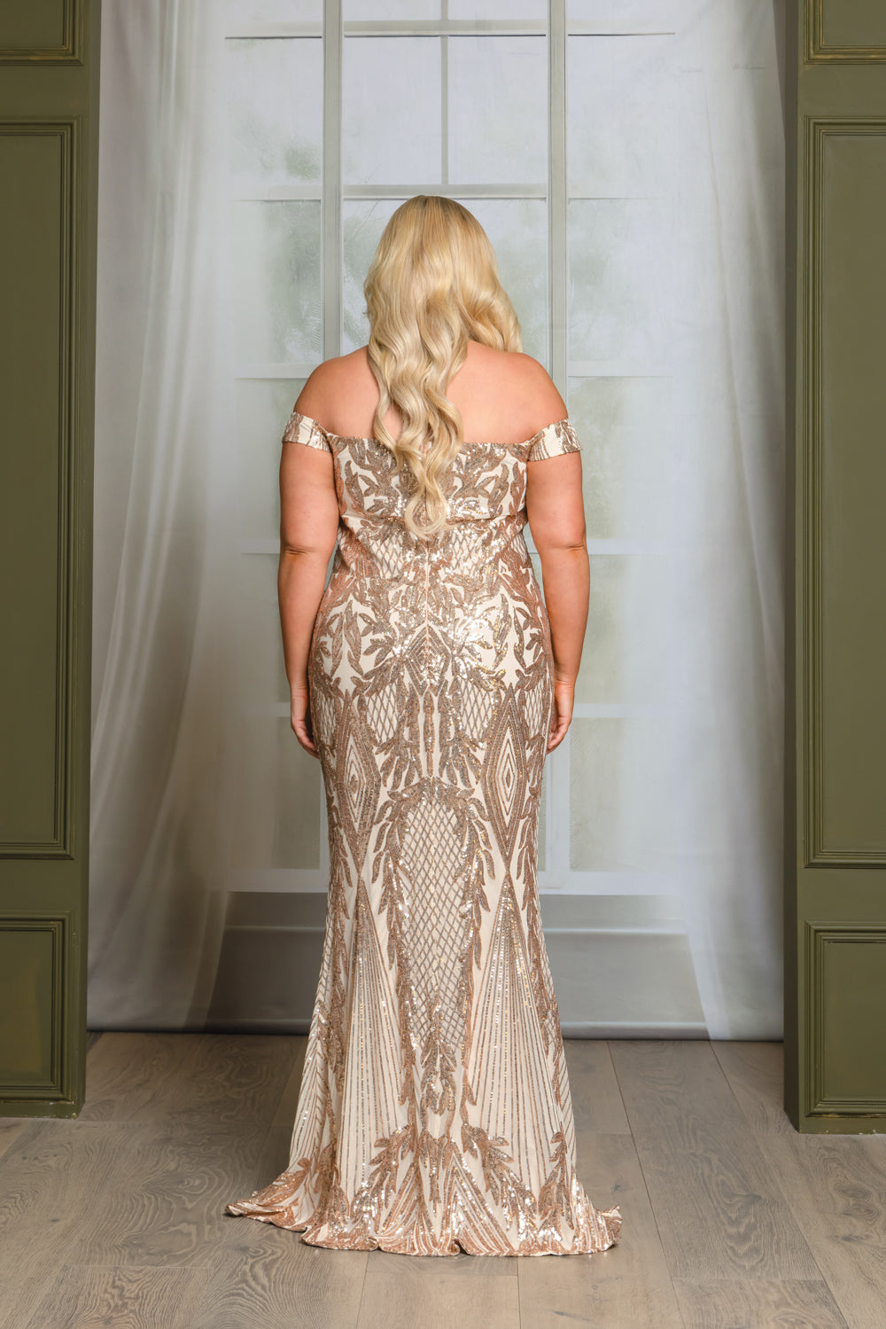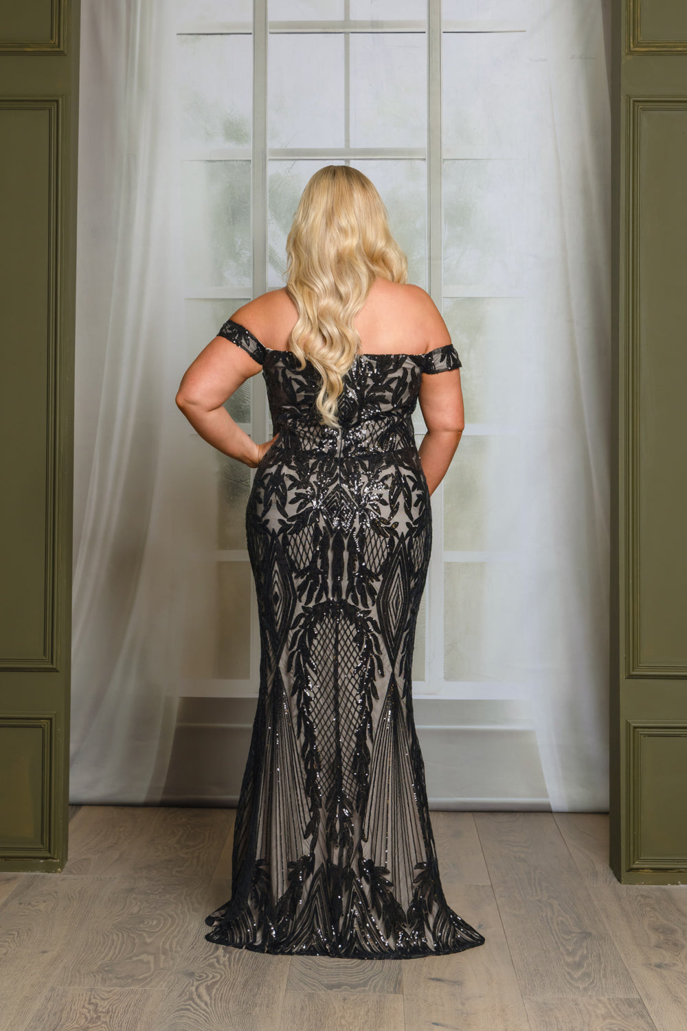 Patterned sequin off shoulder maxi dress with full lining, bra cups, slit, and back zipper. Dress does have stretch.