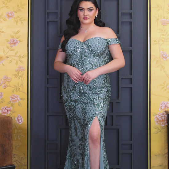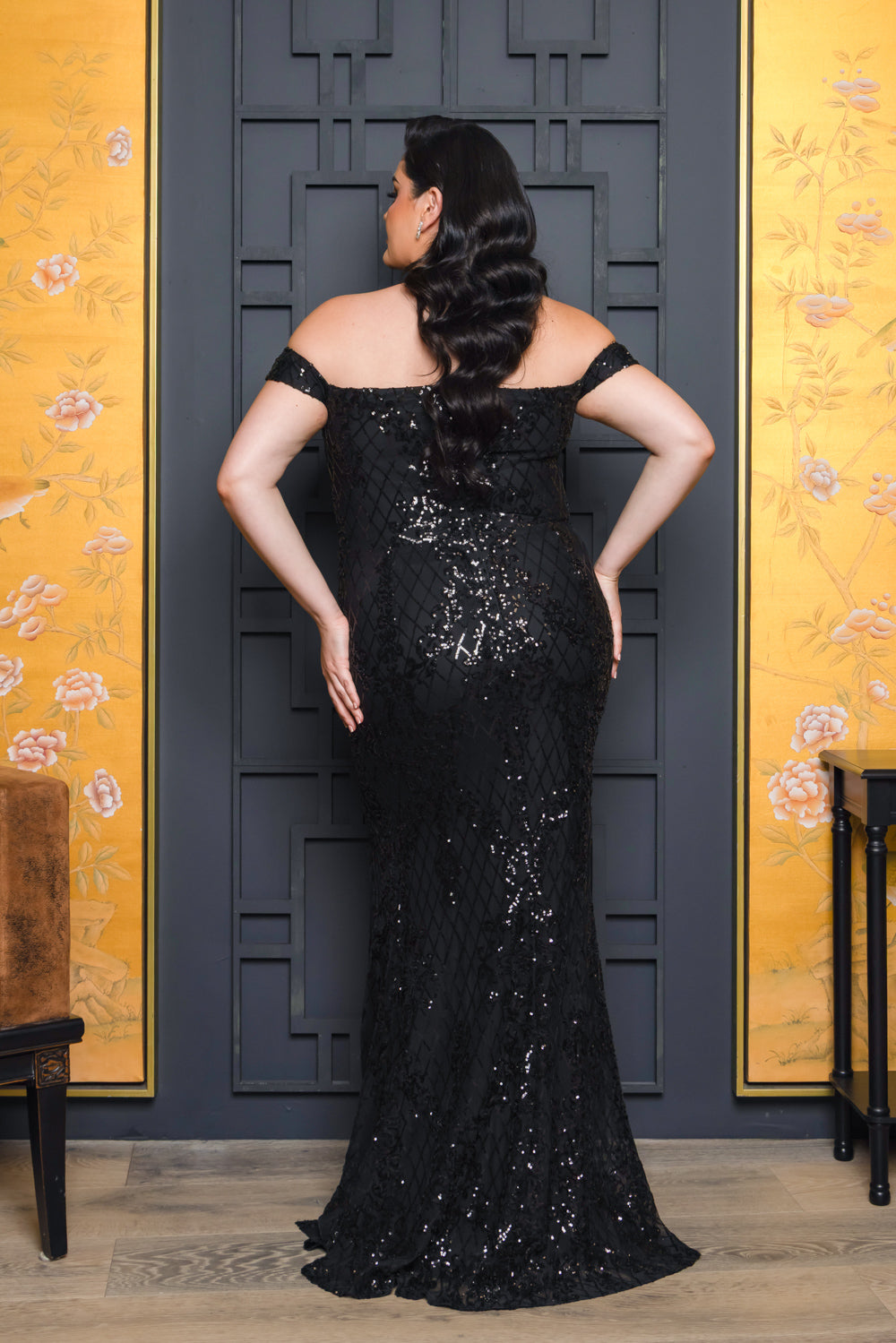 Patterned sequin off shoulder maxi dress with full lining, bra cups, slit, and back zipper. Dress does have stretch.