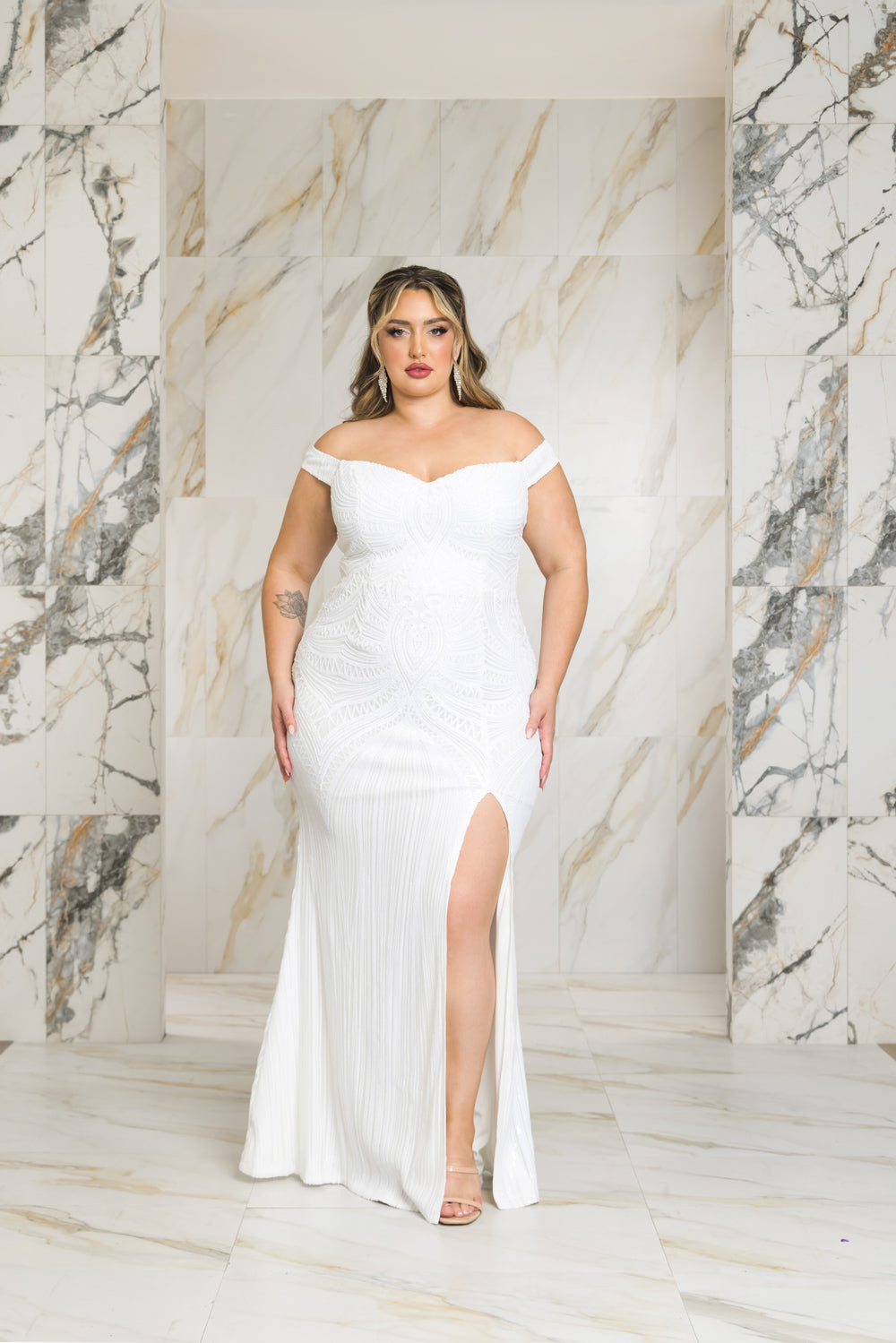 Off the shoulder sequins evening gown in a fit and flare style with sweetheart neckline, slit, and mermaid silhouette.