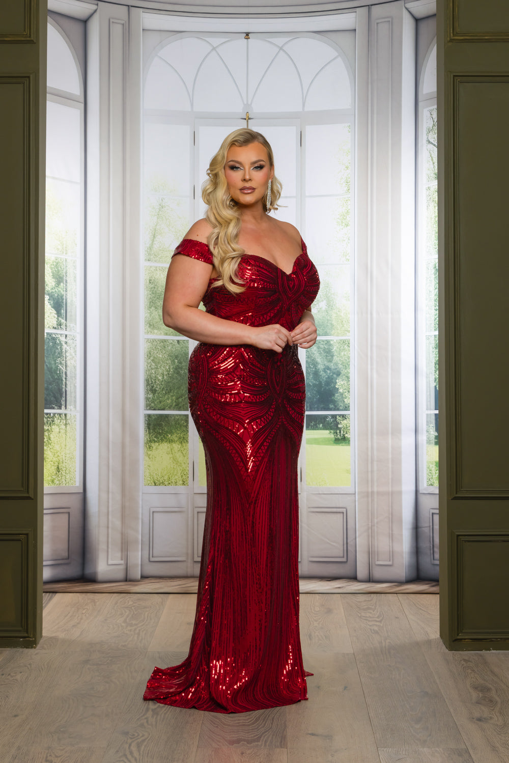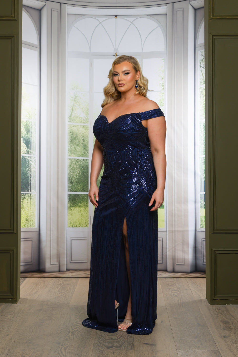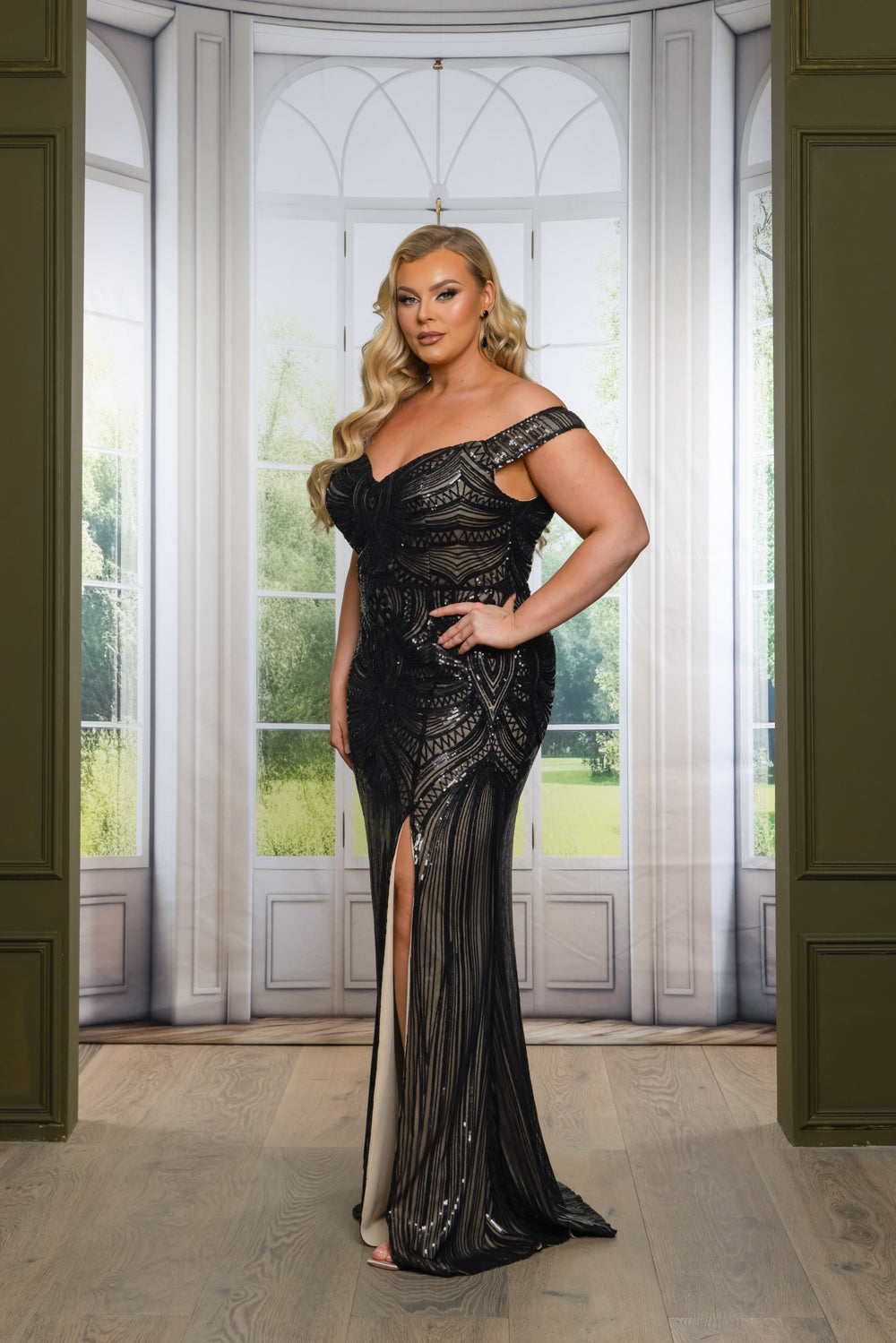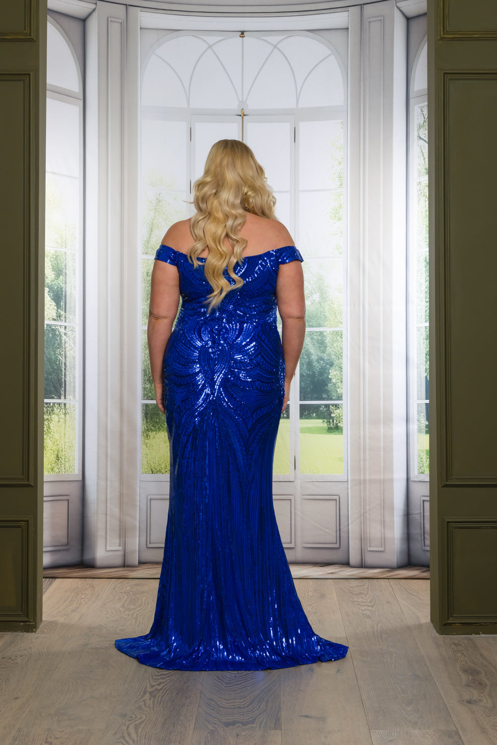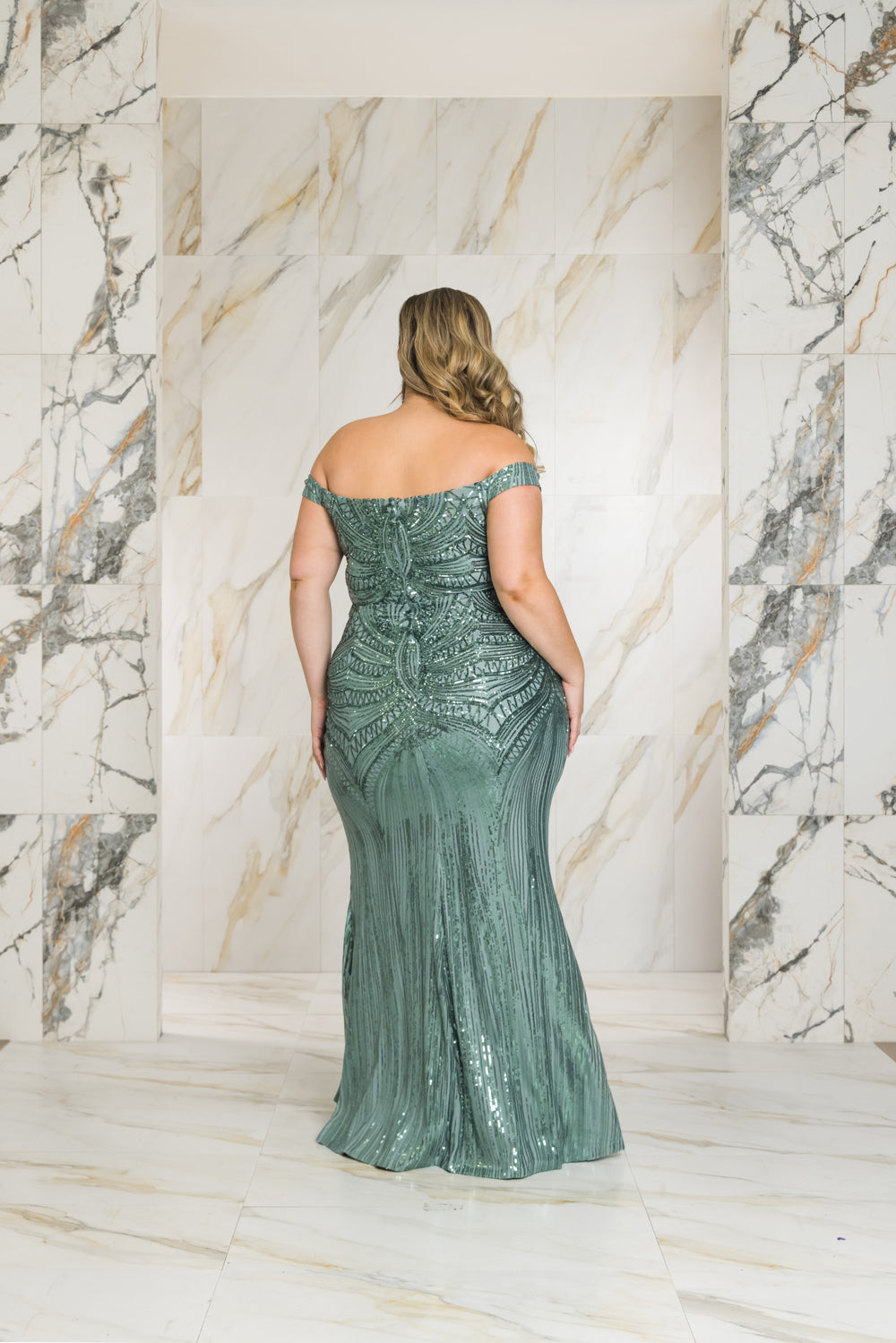 Off-the-shoulder mermaid maxi dress with a slit in patterned sequins. Fully lined on top & skirt. Bra cups added. Invisible zipper at center. The fabric has good stretch.