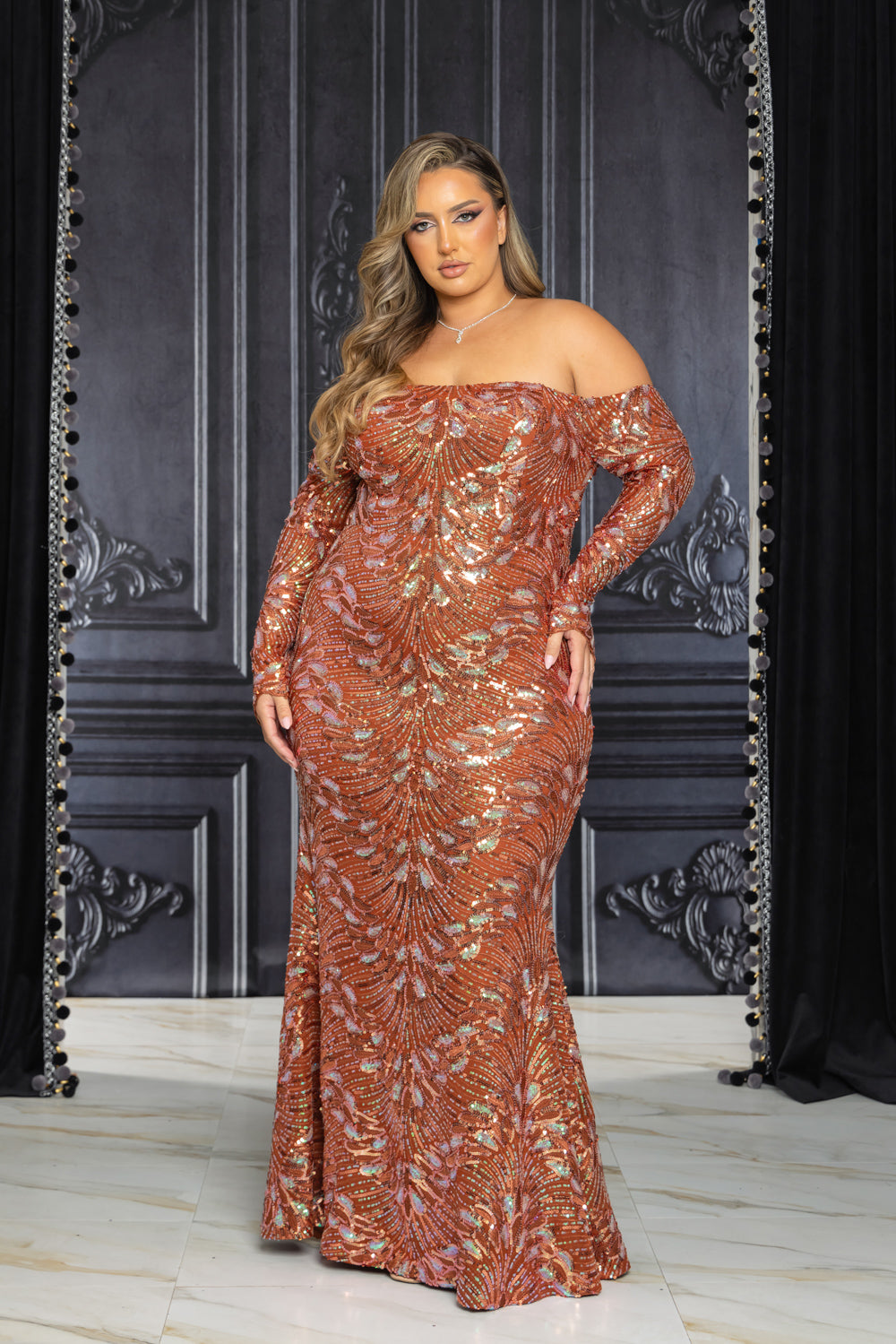 Patterned sequin off shoulder long sleeve maxi dress with no slit, fully lined, back zipper, and very stretchy.
