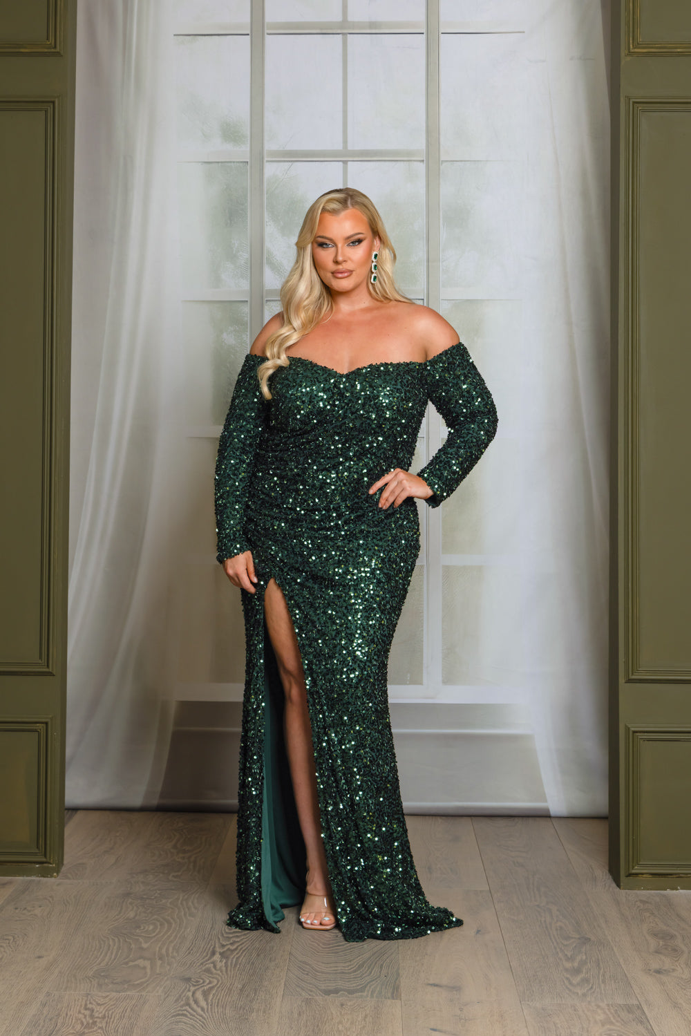 Solid color off shoulder long sleeve sequin maxi dress with bra cups, leg slit, full lining and back zipper. Dress is stretchy.