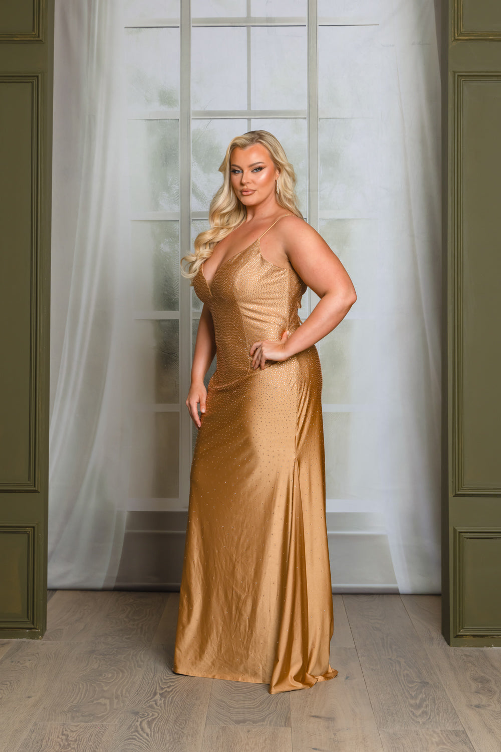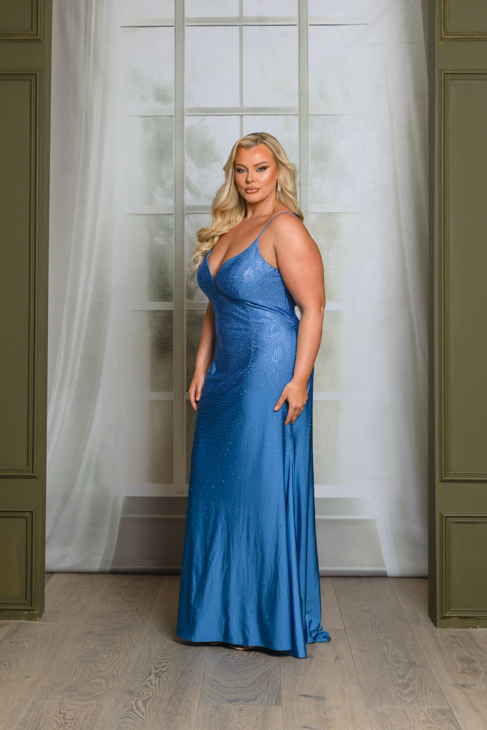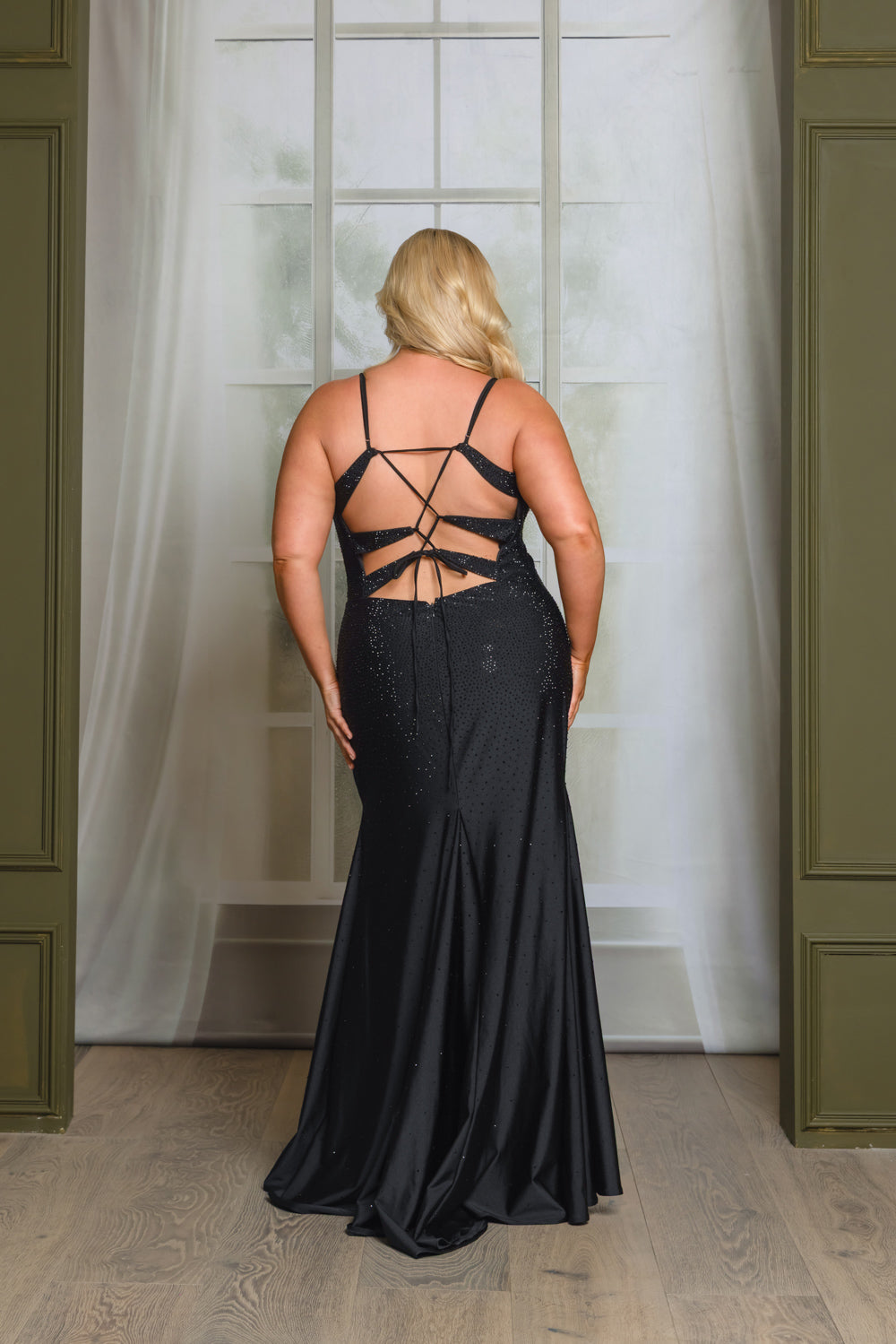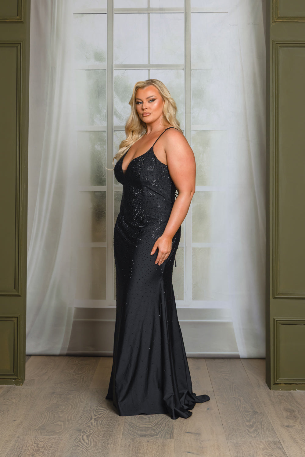 Rhinestone embellished spandex maxi dress with full lining, bra cups, no slit, cross tie back, and back zipper. Dress has very good stretch and has adjustable straps.