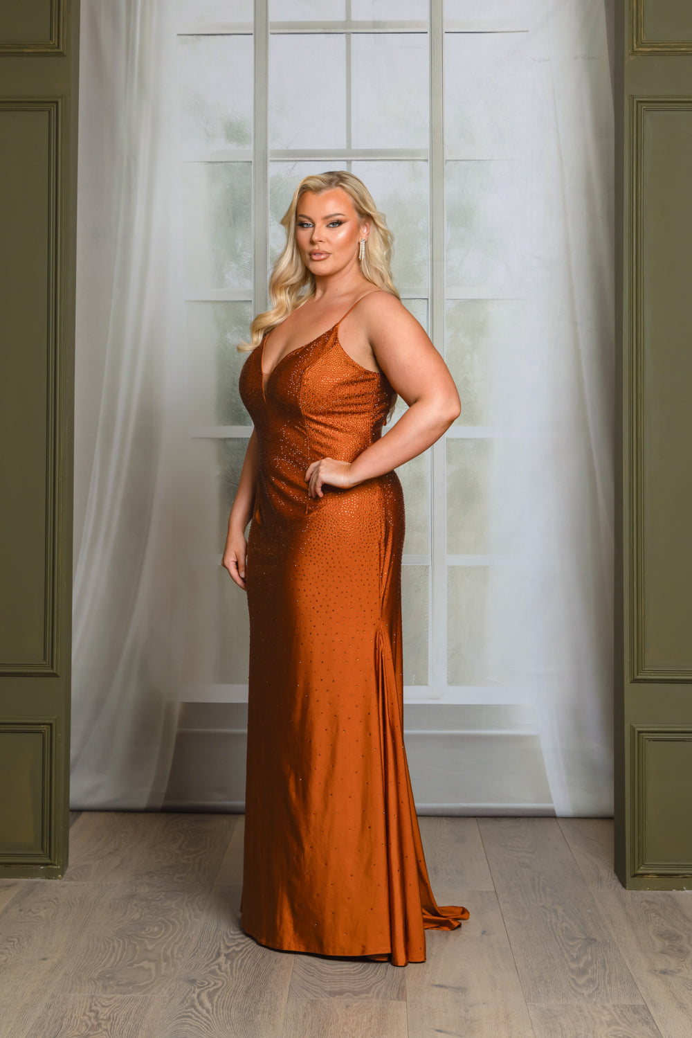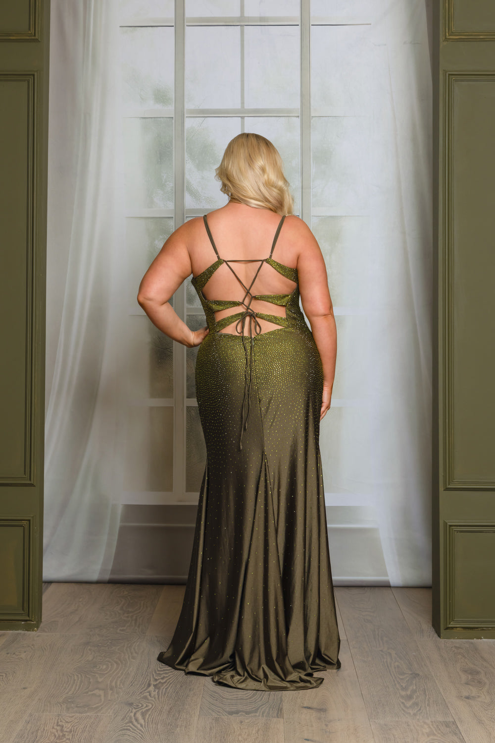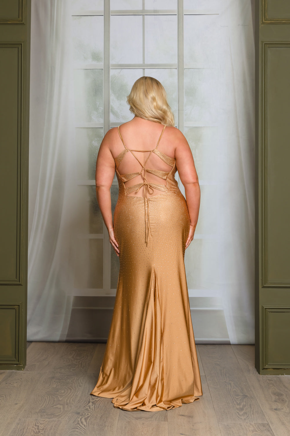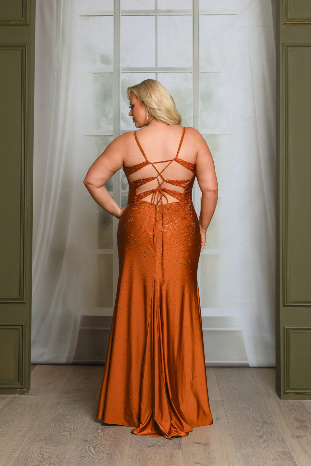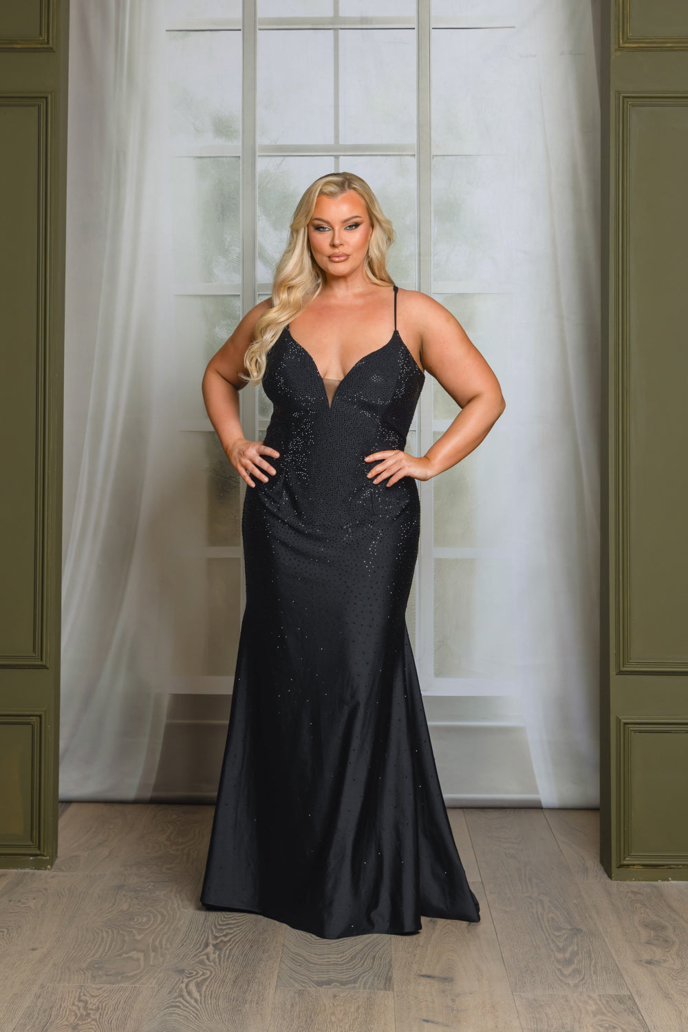 Rhinestone embellished spandex maxi dress with full lining, bra cups, no slit, cross tie back, and back zipper. Dress has very good stretch and has adjustable straps.