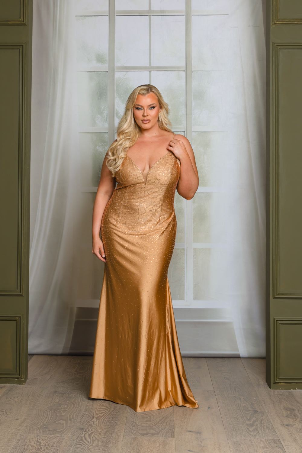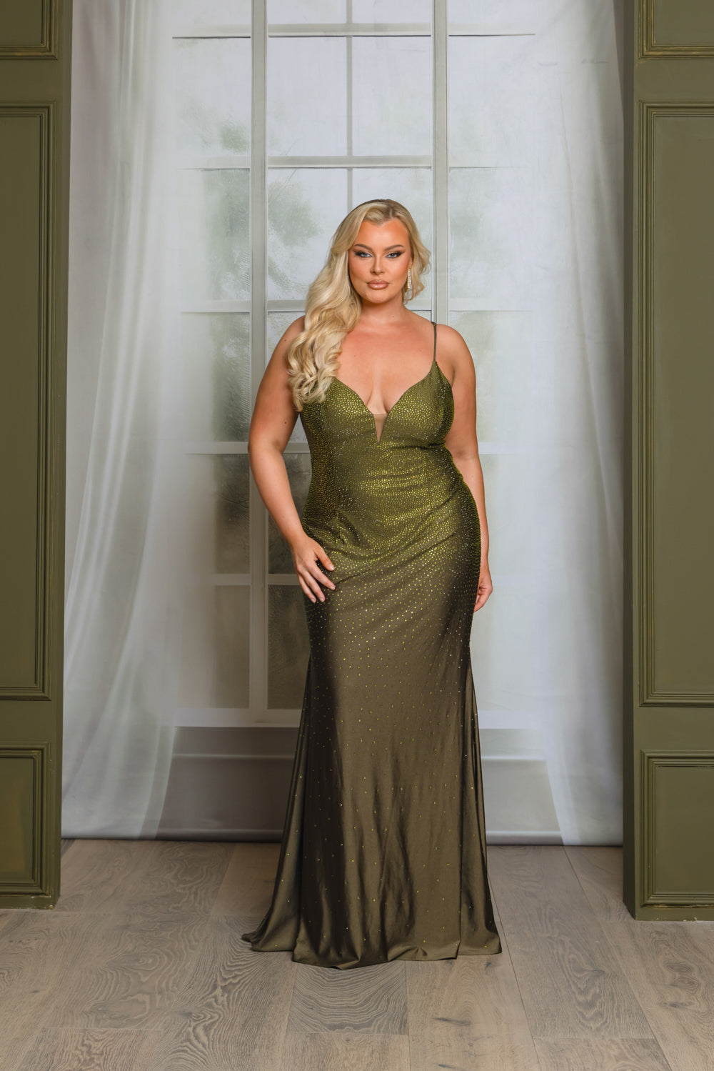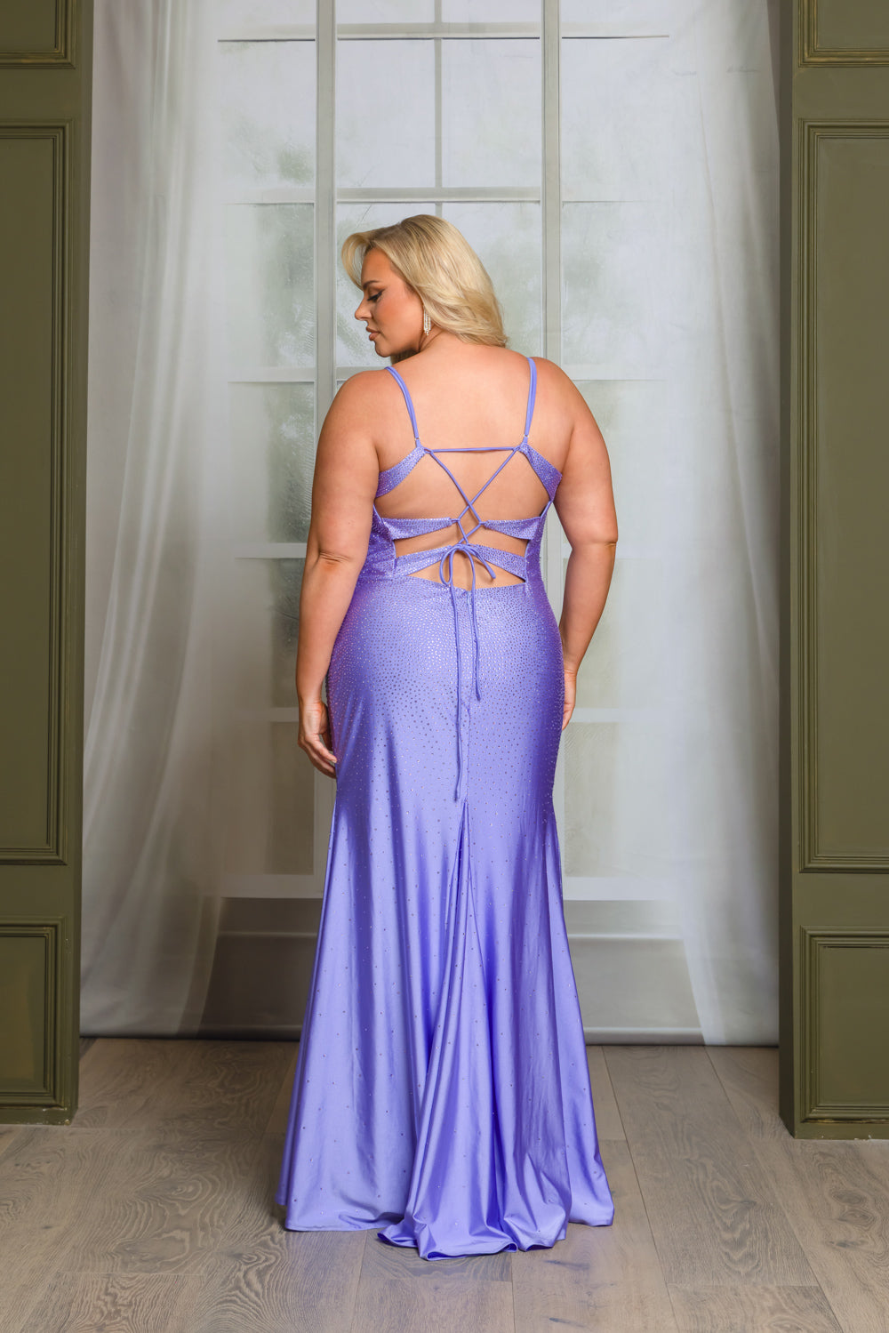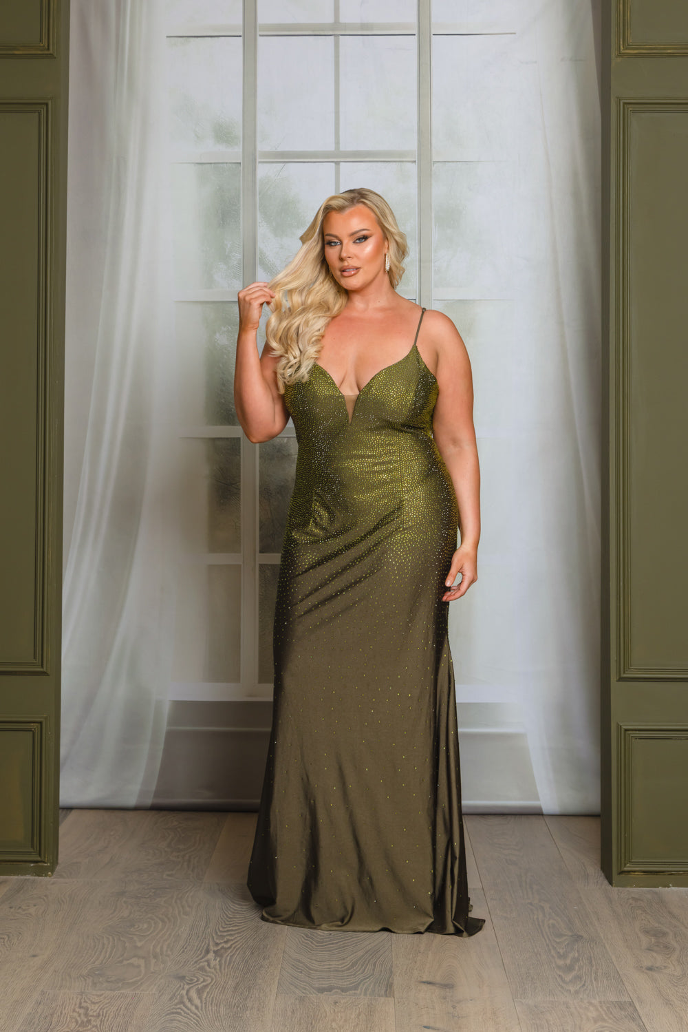 Rhinestone embellished spandex maxi dress with full lining, bra cups, no slit, cross tie back, and back zipper. Dress has very good stretch and has adjustable straps.