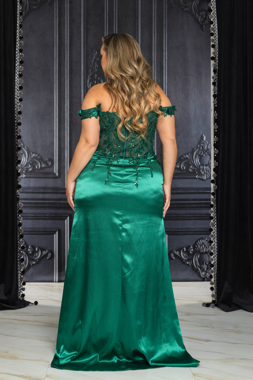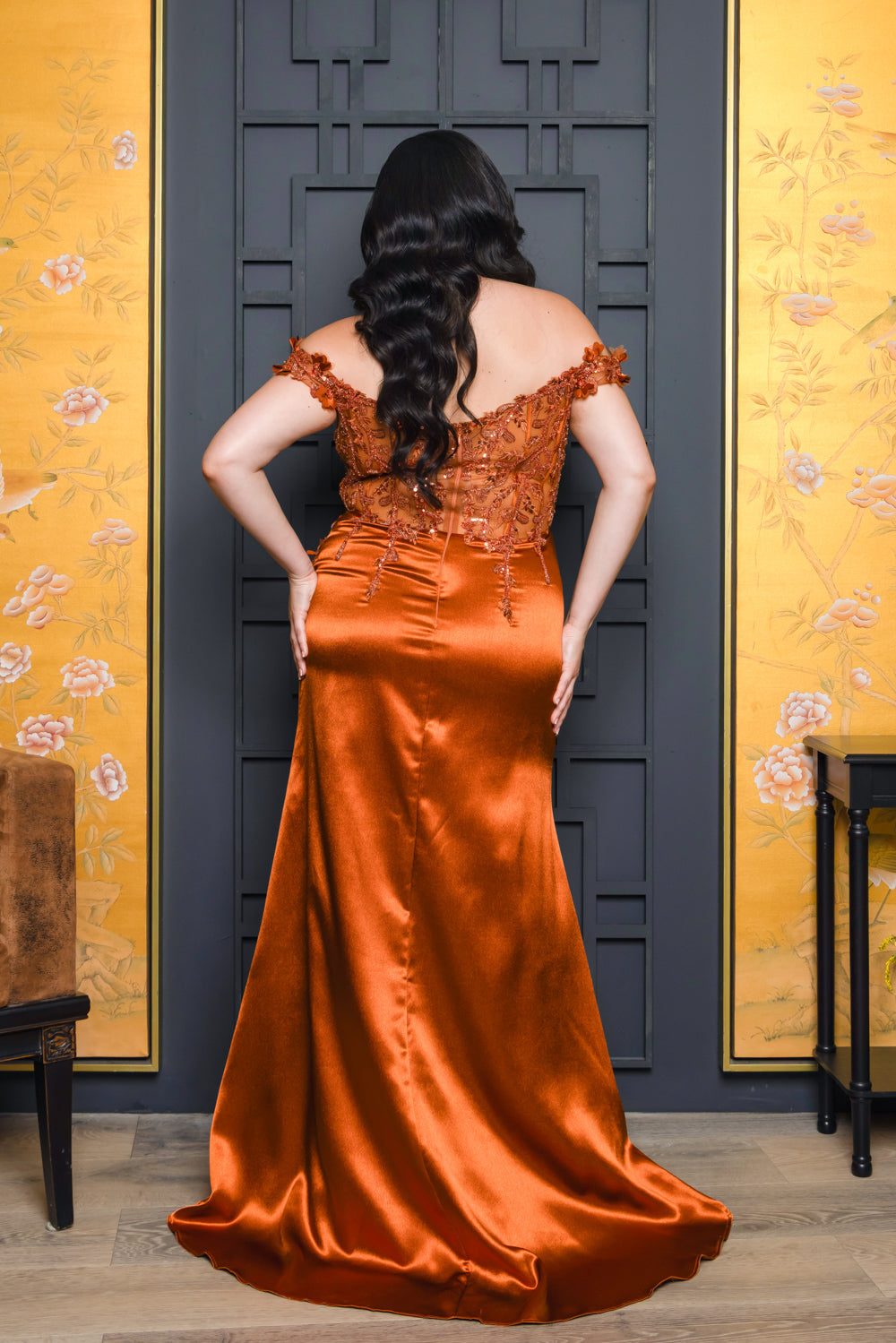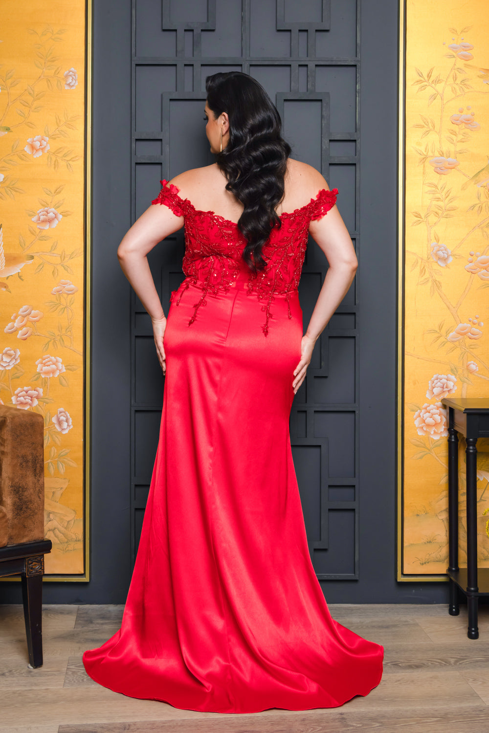 Off shoulder embroidered beaded sequin maxi dress with stain lined mermaid skirt, bra cups, and back zipper.