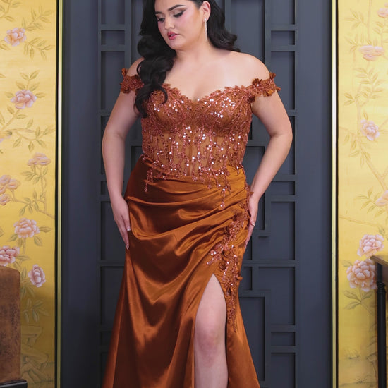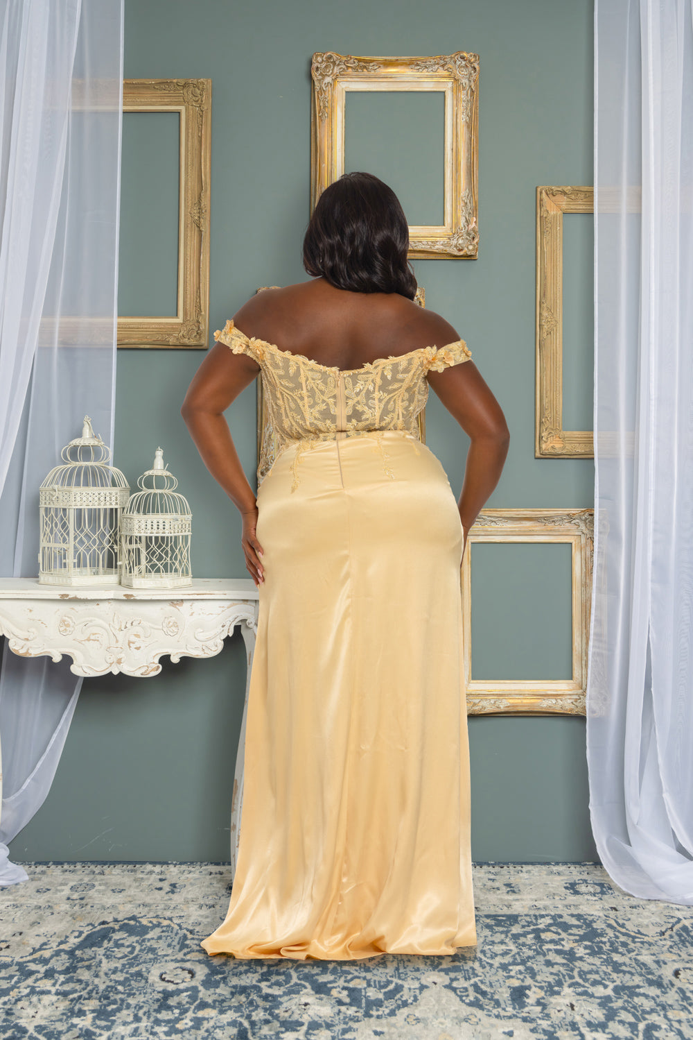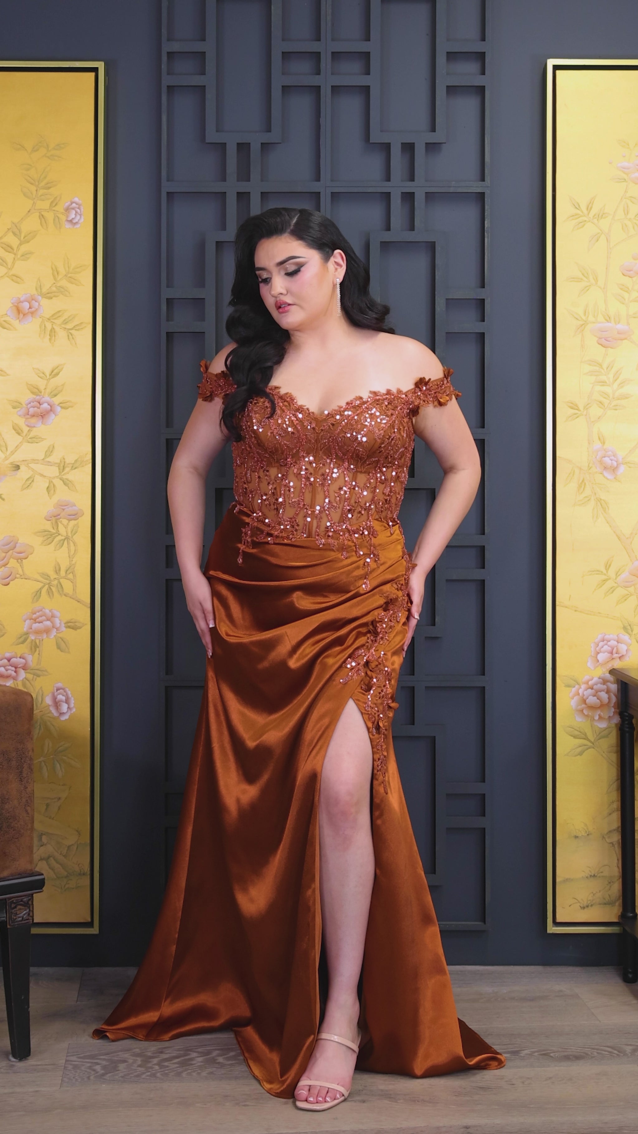 Off shoulder embroidered beaded sequin maxi dress with stain lined mermaid skirt, bra cups, and back zipper.
