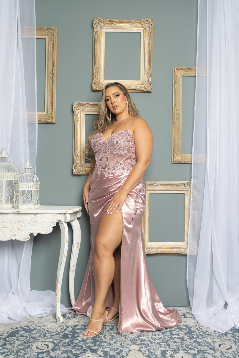 Embroidered beaded sequin maxi dress with satin lined mermaid skirt, bra cups, lace up back, and back zipper.