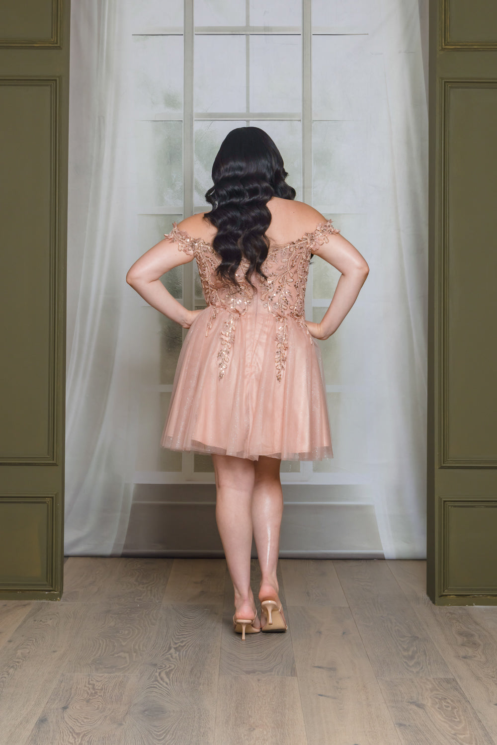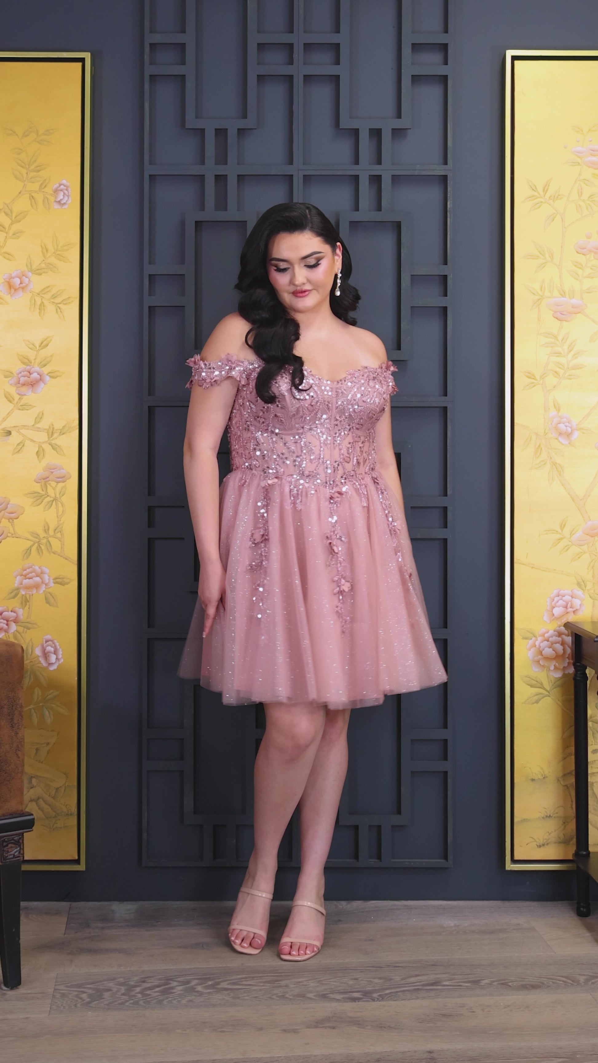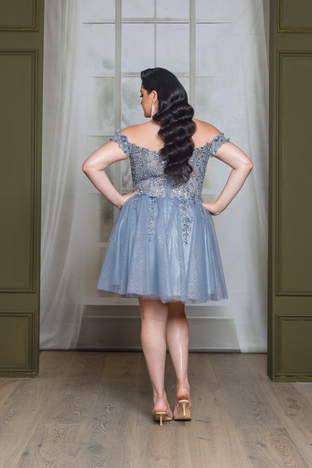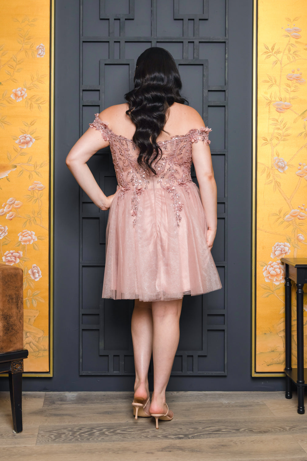 Off shoulder short dress with bra cups. Top is embroidered with flowers and is beaded. Dress has no stretch. Model is wearing a 1X