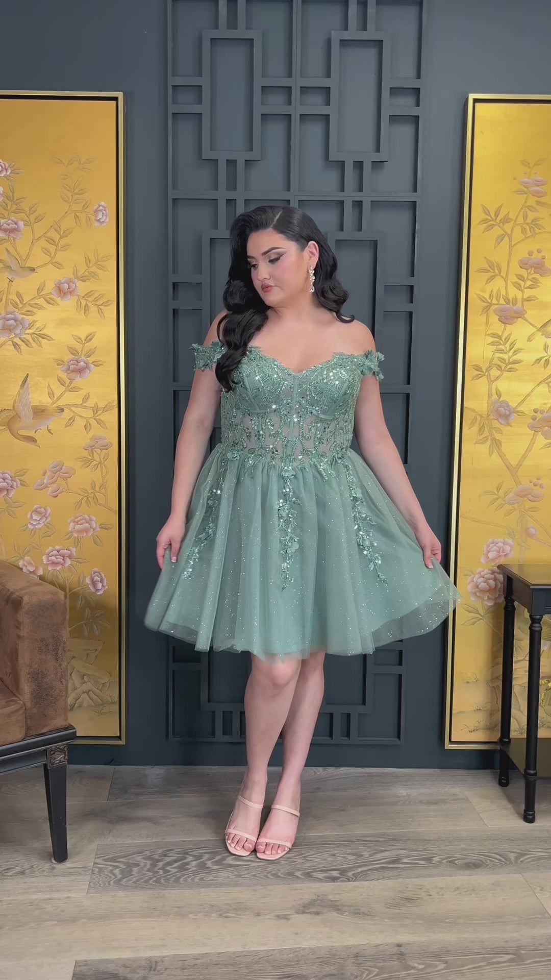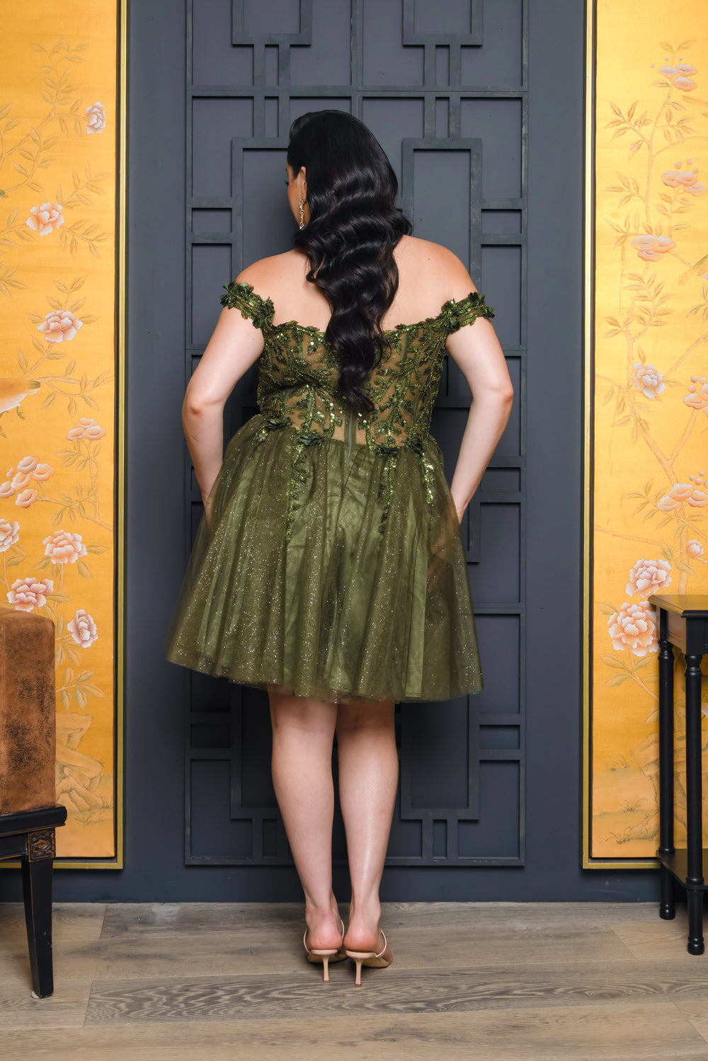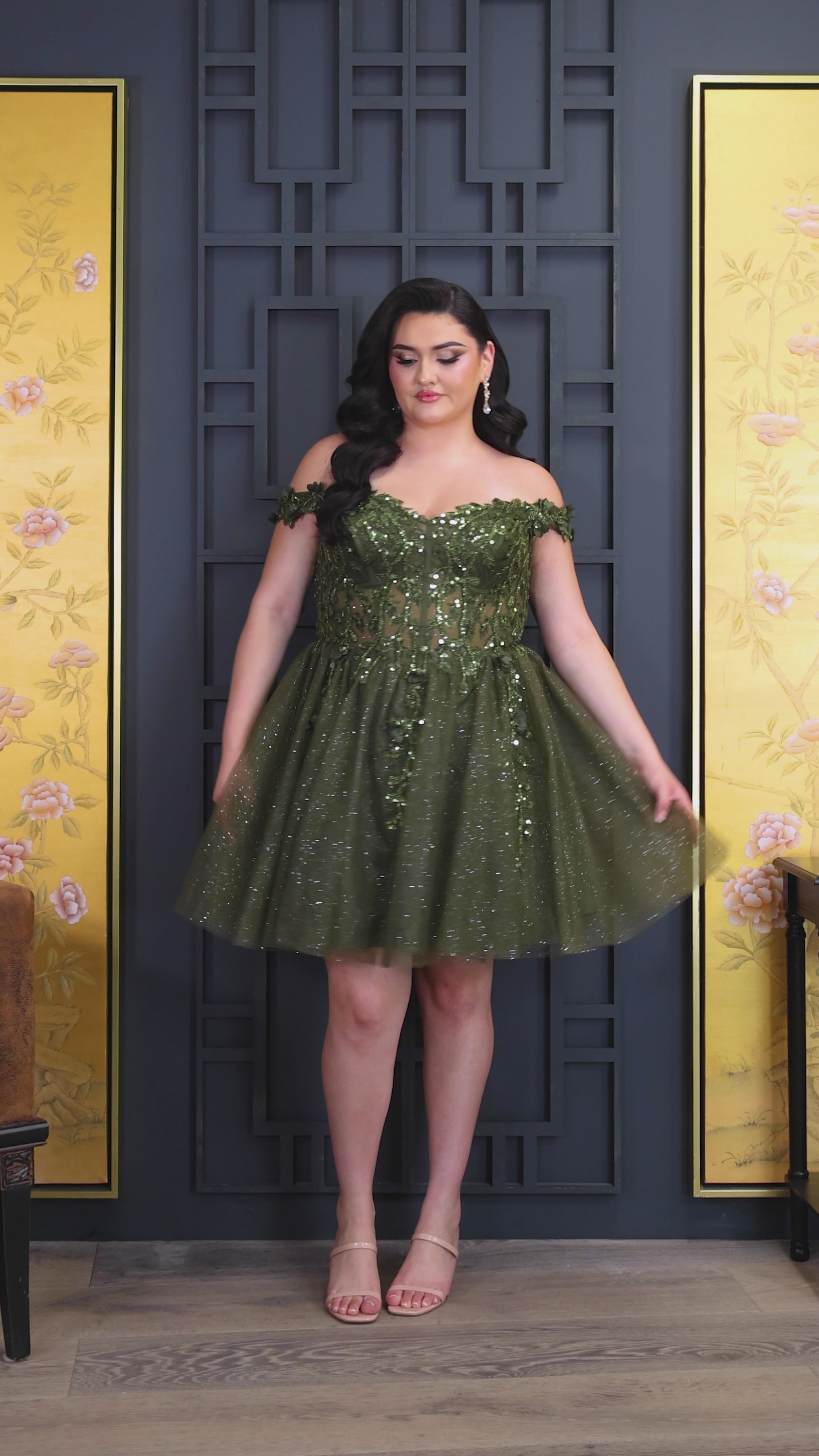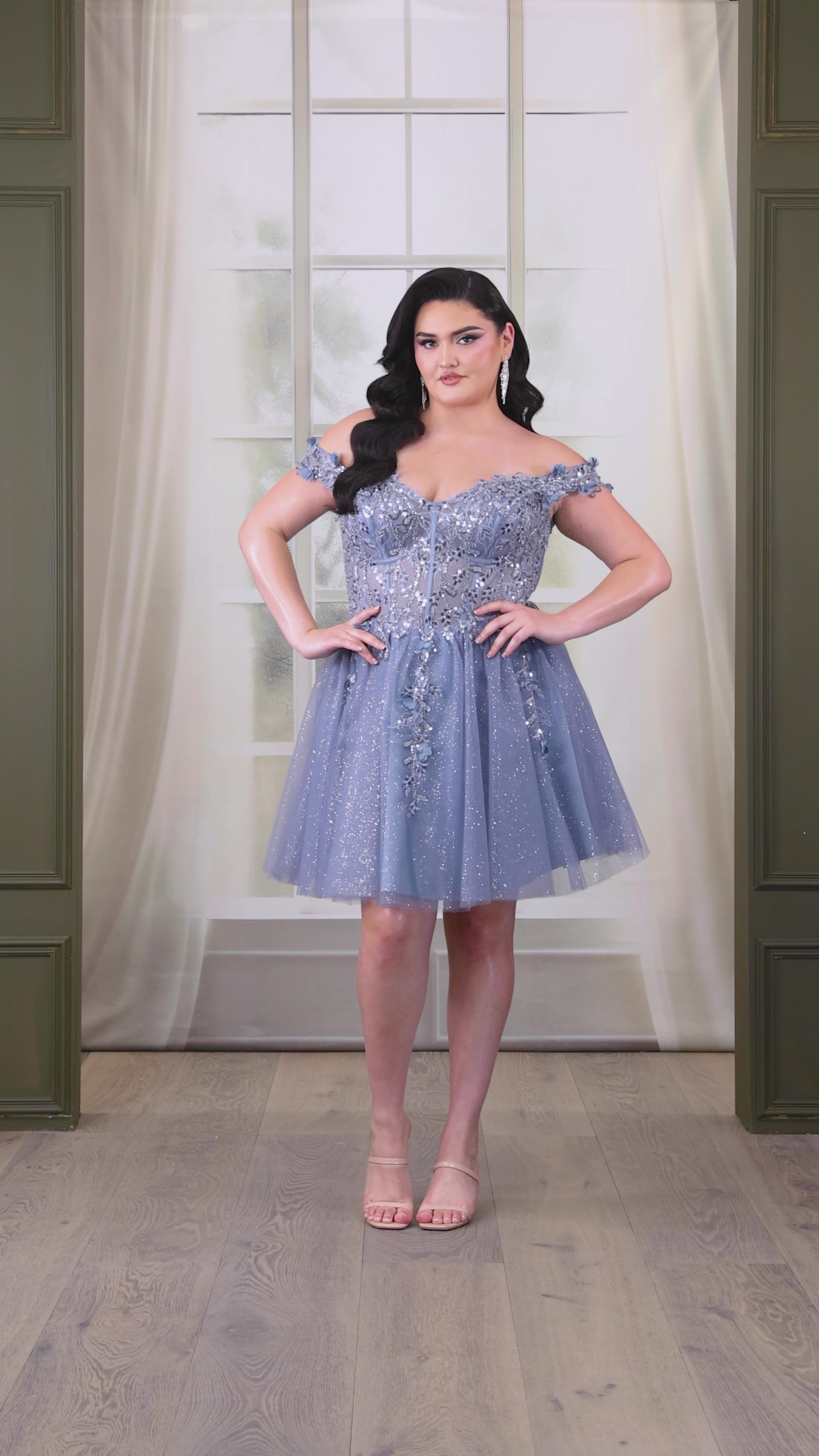 Off shoulder short dress with bra cups. Top is embroidered with flowers and is beaded. Dress has no stretch. Model is wearing a 1X