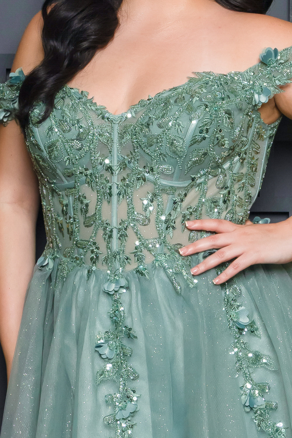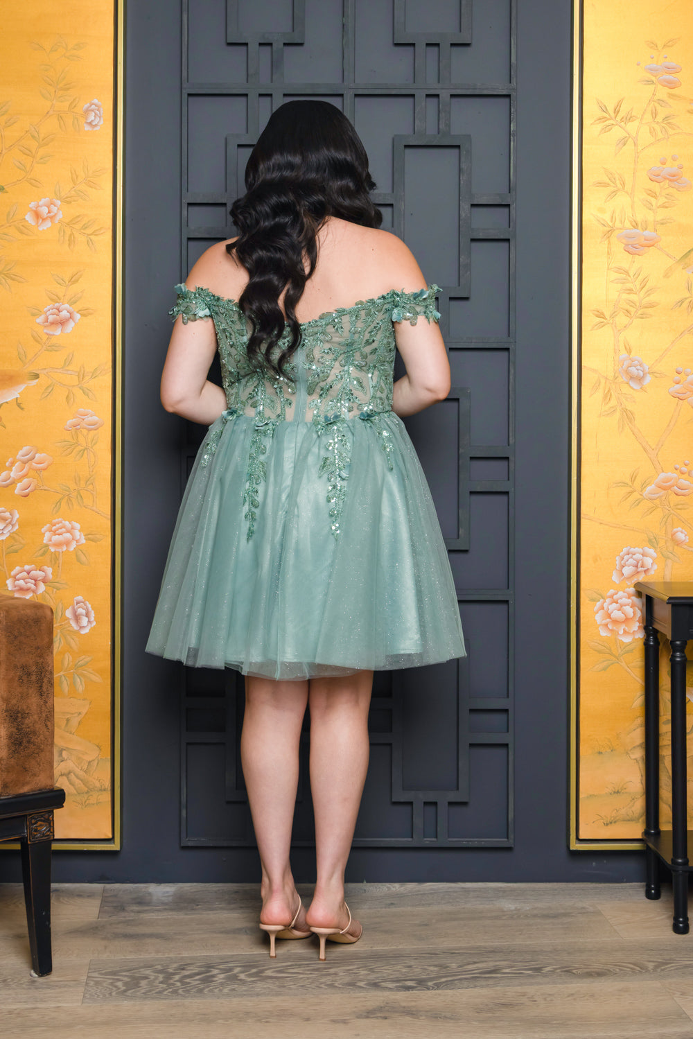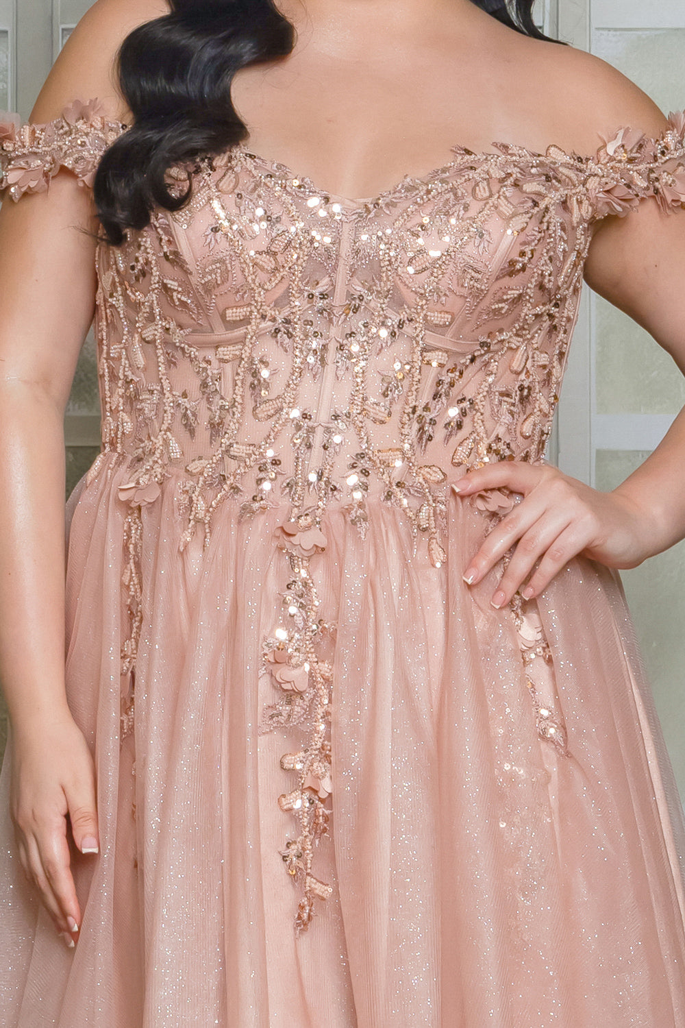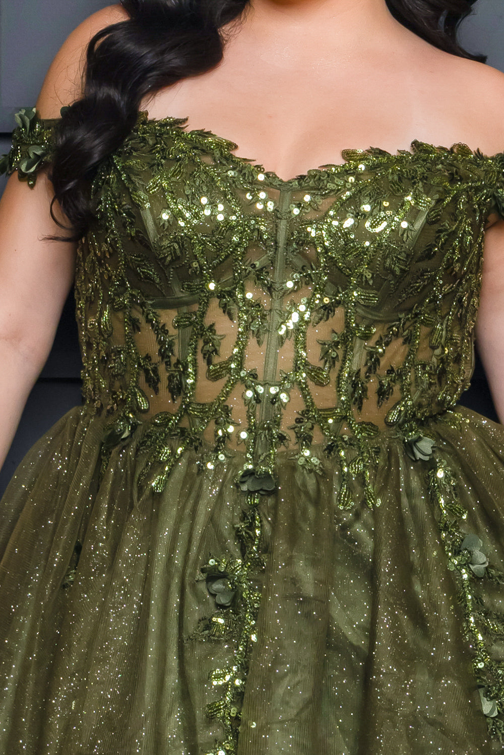 Off shoulder short dress with bra cups. Top is embroidered with flowers and is beaded. Dress has no stretch. Model is wearing a 1X