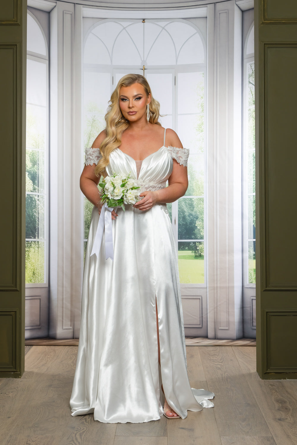 Solid color satin A line maxi dress with adjustable straps, sequin off shoulder straps, full lining, slit, and back zipper. Dress has little stretch.