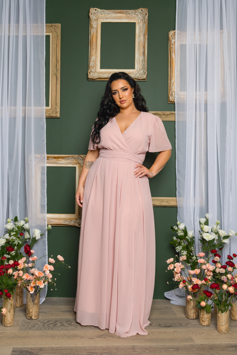 Solid color short sleeve maxi dress with elastic waist, full lining, waist tie, slit, and V-neck. No zipper but dress is very stretch at waist.