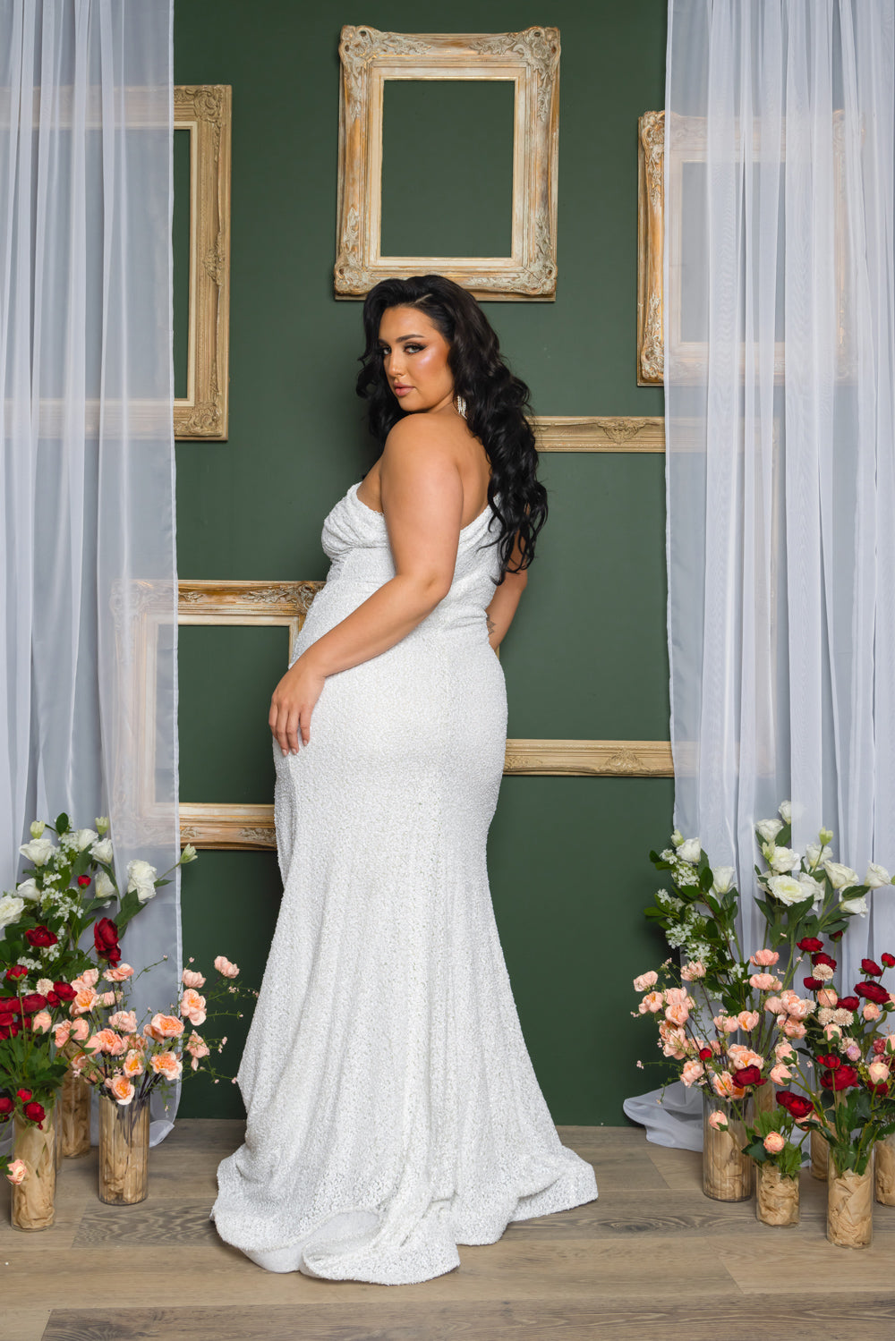 One shoulder white sequin maxi dress, back zipper, and horse hair on the long train. *This style does have a boutique's MAIN LABEL instead of the RICARICA. *